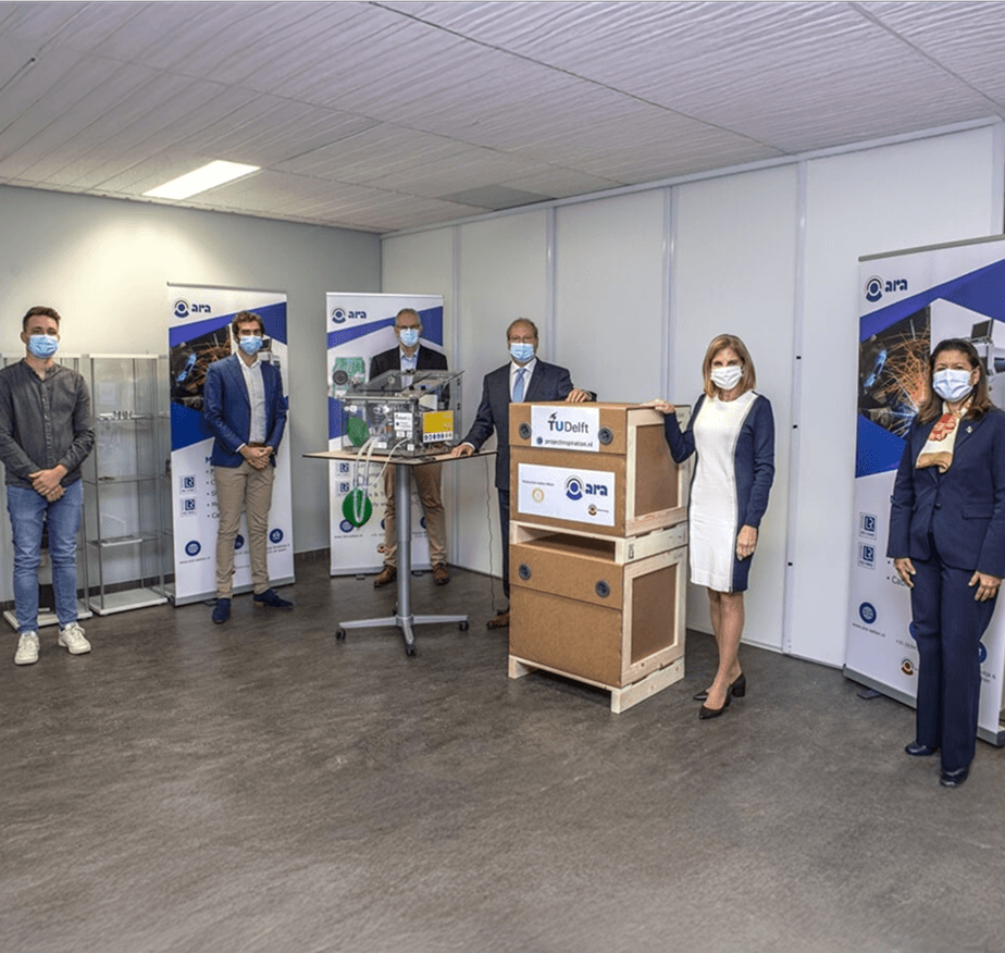 Jarik de Graaff, algemeen directeur van ARA, overhandigde het eerste beademingsapparaat aan mevrouw Elizabeth Ward, de ambassadeur van Panama. “Dit is een vreugdevol moment”, aldus de ambassadeur. “Een nieuwe ontwikkeling vraagt een grote tijdsinvestering. Zeker in dit geval, als het gaat om een bestaand technisch hoogstaand apparaat te vereenvoudigen. Dat lijkt simpel, maar is het zeker niet. Daarvoor heb je creatieve en slimme mensen nodig die out of the box kunnen denken. De samenwerking van de studenten met de mensen van ARA heeft tot een prachtig product geleid. Een apparaat waar een mensenleven mee gered kan worden. Het is een overweldigend cadeau.